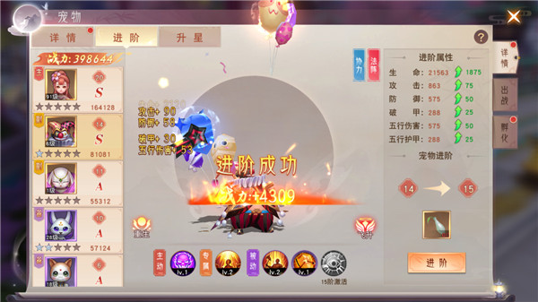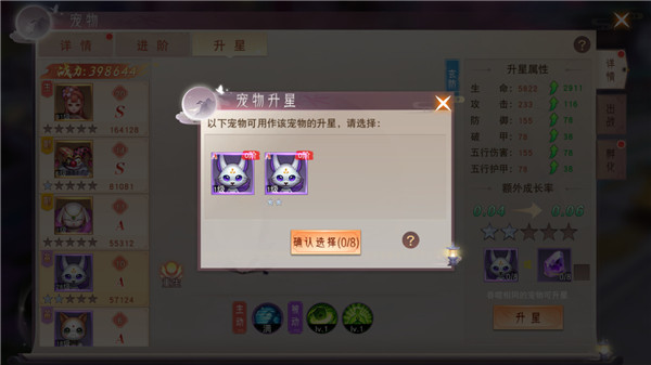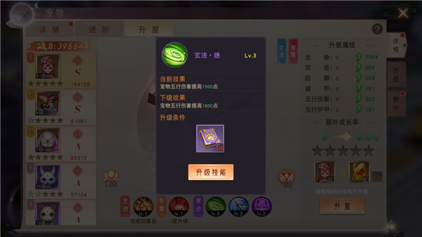 如果获得了重复的宠物,还能让宠物吞噬而升星,升星获得的战力加成非常大哦。另外,万能灵石也能让宠物升星,但是必须对应宠物的品级。