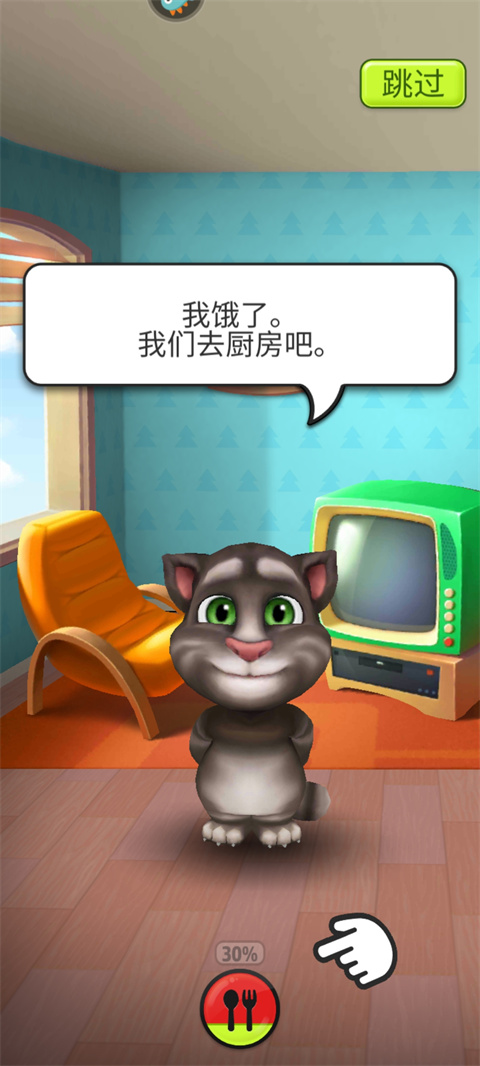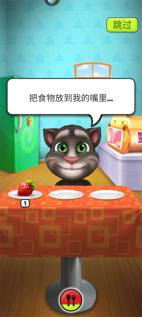 1、如果汤姆猫饿了,那么我们就需要点击下方的餐具图标去厨房;