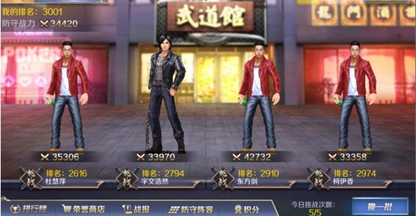 竞技场内显示的可挑战的其他人都显示防守阵容的战力,我们可以通过战力来计算是否能赢得PK,还可以设置自己的防守阵容来防御其他大哥向您发起的挑战。