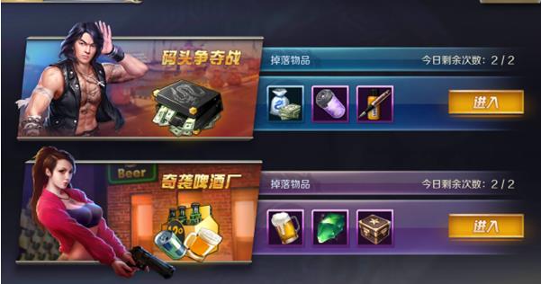 其中码头争夺战可以获得大量钞票,而奇袭啤酒厂可获得大量啤酒,可不要小看了啤酒,啤酒可是英豪升级的必备资源。
