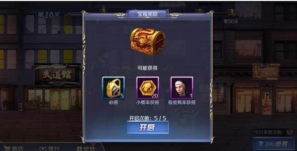 9、每过十关就会有一个宝箱奖励,宝箱中也蕴含着大量丰富的资源。勇闯铜锣湾每日可以重置两次,每天第一次重置免费,第二次需要200钻石。重置之后积分是不会被重置的。所以我们可以放心的重置次数来换取资源哦!