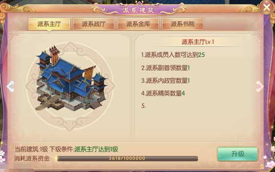 其次升级派系,因 为一开始派系的人员位置有限需要升级派系增加位置才会有更多的派员加入进来。已经进入派系的派员签到、做派系任务、友好派主设定的权贵(政务任务)