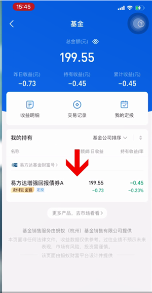在支付宝理财功能内点击底部持有即可查看自己所购买的基金,点击需要取出的基金,