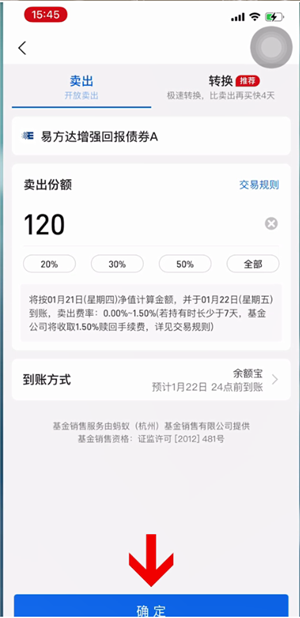 点击卖出/转换,输入收益份额再点击确定,输入支付密码即可卖出。