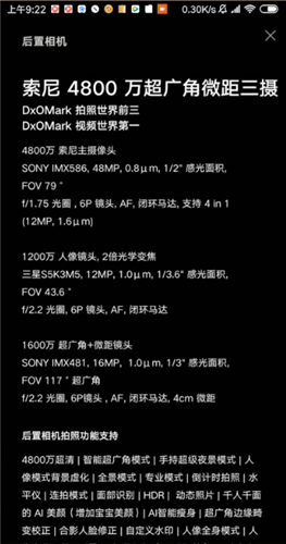 小米9普通版后置拍照是索尼4800万超广角微距三摄,尊享版除了有相同的配置外增加了一片镜头达到7片,光圈也进一步提升至F1.47。