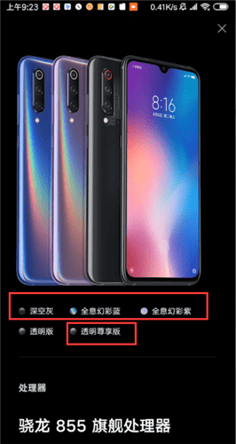 小米9普通版可选颜色为深空灰、全息幻彩蓝和全息幻彩紫,而尊享版只有透明版。