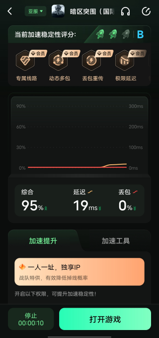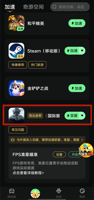 2、在加速器界面选择暗区突围国际服加速的区服,进行加速,之后会自动为你启动游戏。