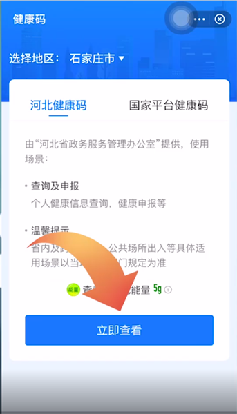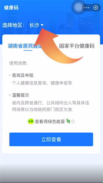 第二步:这时即可看到健康码页面的左上角“选择地区”,点击三角图标,
