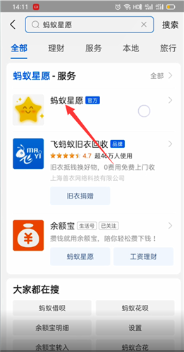 打开支付宝APP,在搜索框中输入“蚂蚁星愿”,并点击搜索,