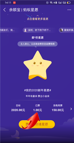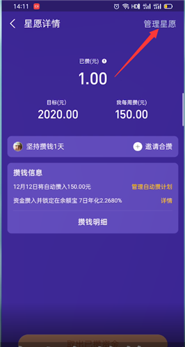 选择蚂蚁星愿,点击进入蚂蚁星愿,点击已攒的金额,进入金额查看界面,