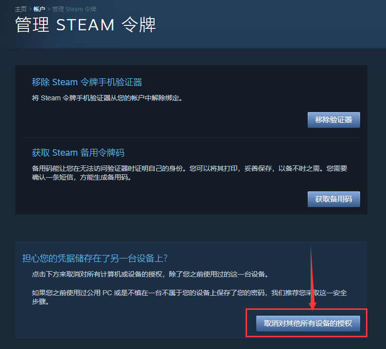 首先登录steam客户端,点击右上角个人信息下的账户明细,选择下方的管理steam令牌。点击取消对其他所有设备的授权。