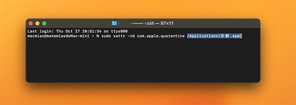 安装完成后对应用进行签名,复制以下命令粘贴到终端:
