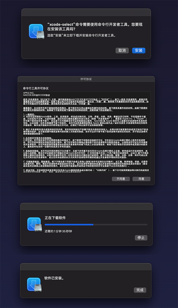 弹出安装窗口后选择安装,安装过程需要几分钟,请耐心等待。安装过【xcode-select】不用再次安装,直接看下面的终端签名教程。