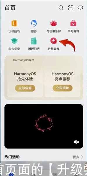 首先打开华为手机系统自带的【我的华为】软件,然后点击首页面的【升级尝鲜】图标,