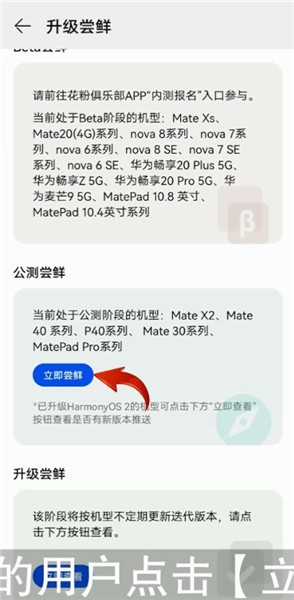 目前Mate 40系列手机处于公测阶段,所以用户只需在【公测尝鲜】下方点击【立即尝鲜】按钮,