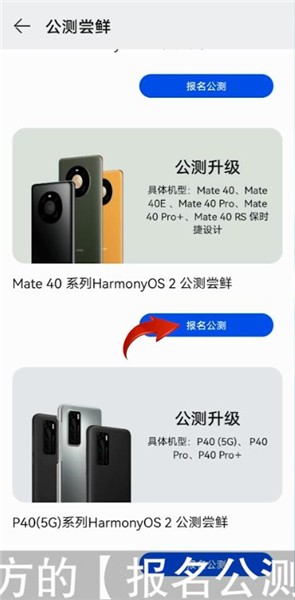 接着点击【Mate 40系列HarmonyOS 2公测尝鲜】字样下方的【报名公测】按钮,