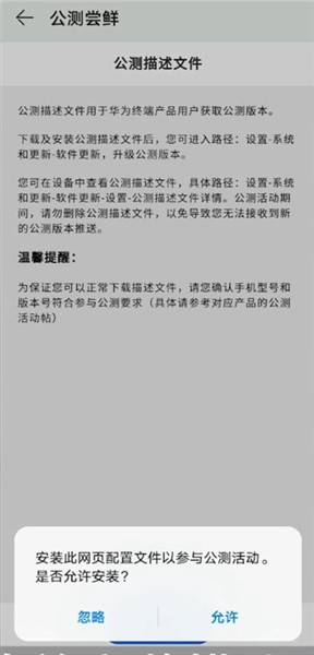 再点击下方【参与公测活动】按钮,阅读并同意协议,最后下载并安装描述文件即可,安装完成后可以在系统【设置】中升级公测版本。