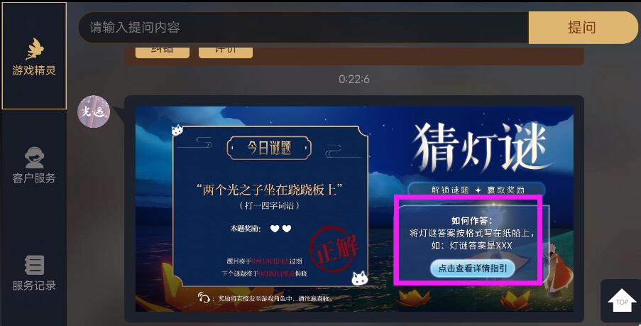 光遇中秋节灯谜活动开启了,今天9月19日灯谜的谜题是:两个光之子坐在跷跷板上,那么灯谜答案是什么呢?下面一起来看一下光遇9.19光遇灯谜答案介绍。