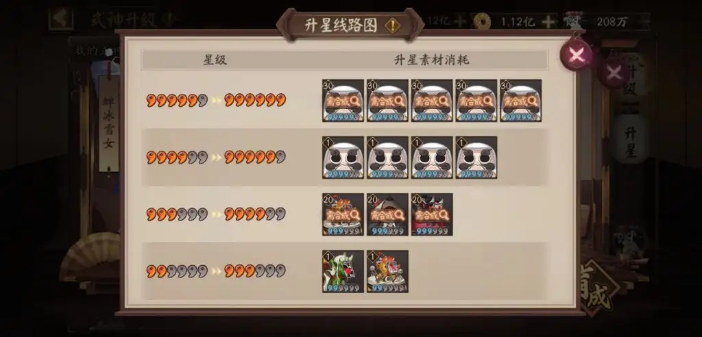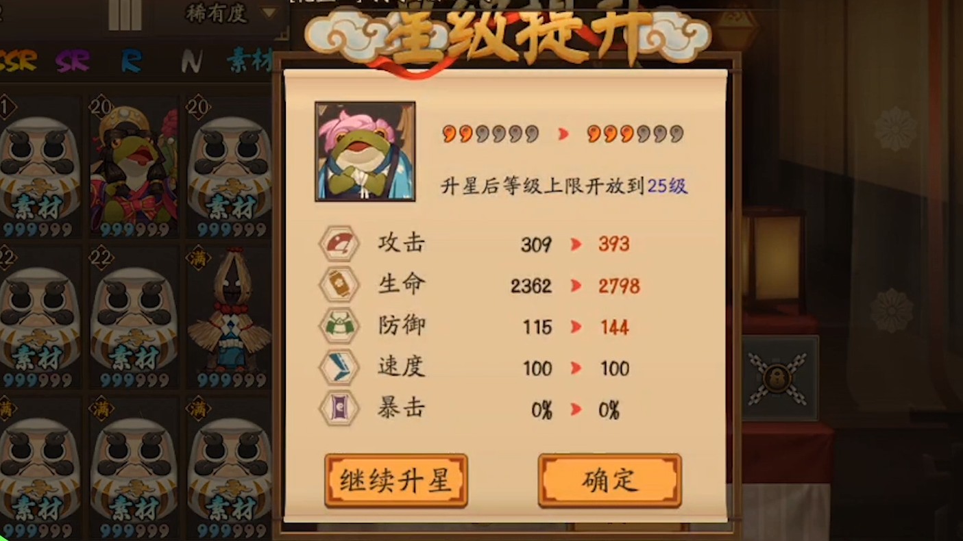 7、此外升星需要玩家使用同星级的式神或者达摩素材,升星与式神的稀有度无关!2星升3星:等级达到20级满级,放入2个2星任意等级的式神即可。因此这里可以使用平时脸黑抽到的一堆2星1级N卡,用于给式神升3星。3星升4星:等级达到25级满级,放入3个3星任意等级的式神即可。(4星升5星以此类推)
