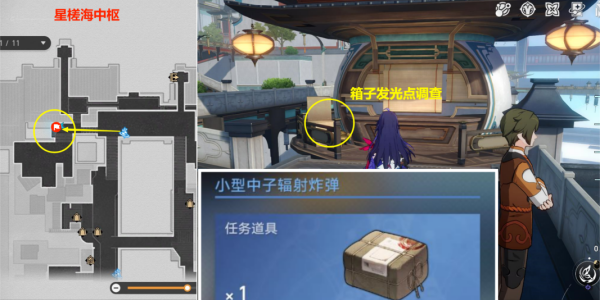 1、首先先来到星槎海中枢的下图位置,到达之后调查发光点即可获得小型中子辐射炸弹;