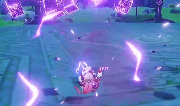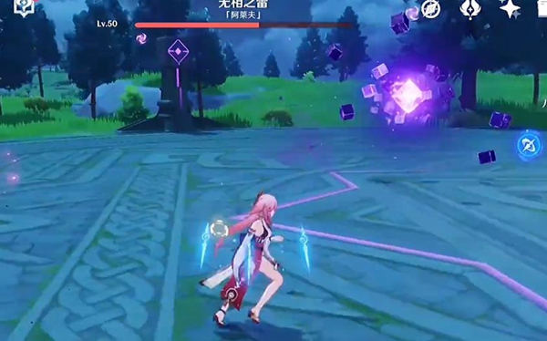 2、然后我们让一个角色被无相之雷的石头剪刀布三个技能全部命中并且不死。(建议使用雷元素角色抗下这套伤害)