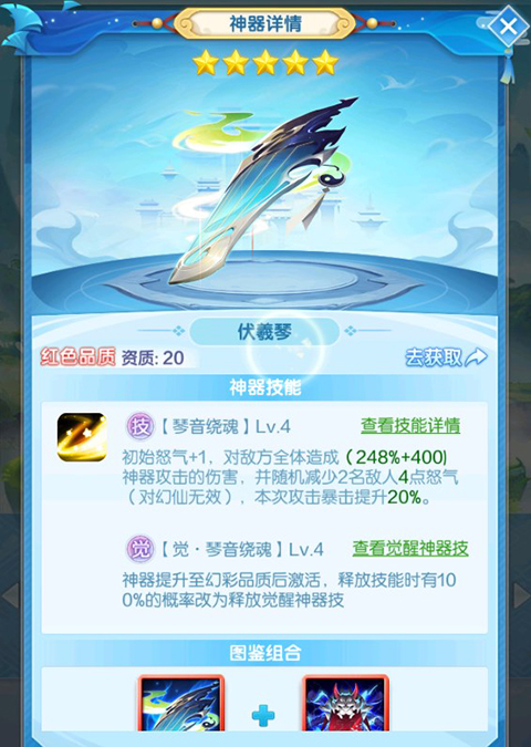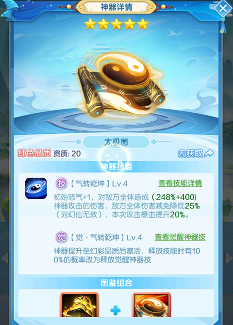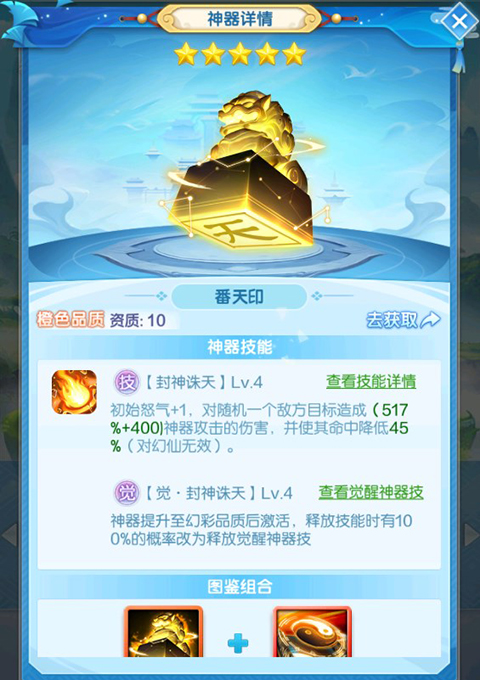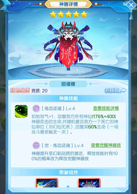 橙色神器,使用60个碎片即可合成,以恢复生命为主,可以大幅提高神将持续作战能力,可以和神剑进行搭配组合。