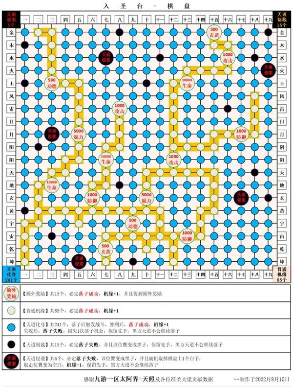 3.对弈天道:准圣后需要花1000玄黄买书,然后在凡界和三界的随机位置会出现一朵小紫花,每天点击小紫花(不需要点进图里)就可以获取2个棋子,去棋盘下就完事了。每获取32缕机缘可以拿到一本天道秘诀,一共5本。棋盘如下图