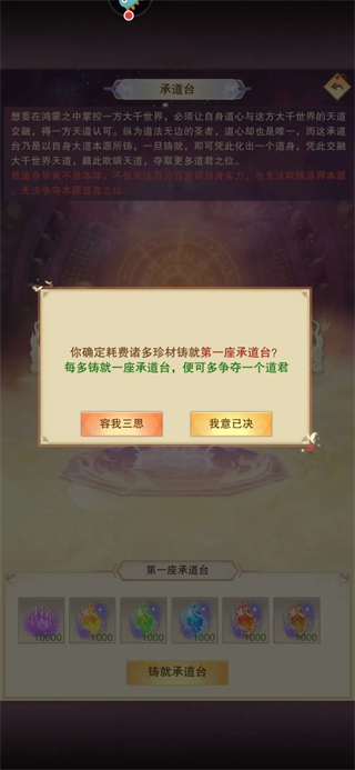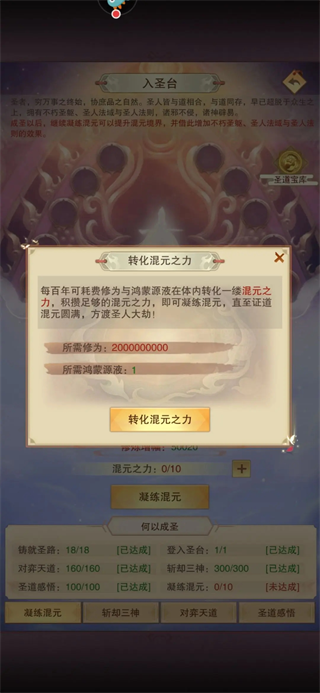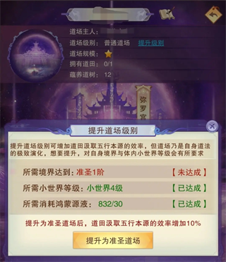 4.升级鸿蒙道场:将普通道场升级为准圣道场。可以增加道田10%的材料产出。