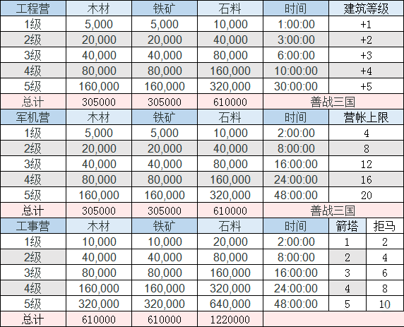 工事营:解锁大地图上箭塔、拒马以及营帐的建造,并提升数量,要求君王殿八级,工程营一级