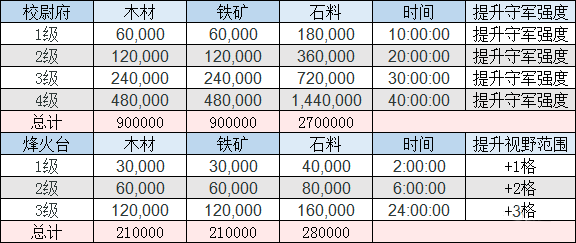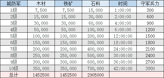 满级建造所需总计:木头和铁矿各145万2500,石头290万5000