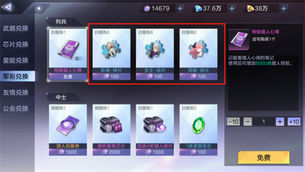 当然除了招募之外,部分B级猎人的碎片可以在军衔商店中通过勋章兑换获取。因为是每日限购的,所以如果你不想让你的猎人培养比别人落后太多,在有勋章的情况下,记得要每天兑换,这样我们才能将几名B级猎人较为迅速得提升到高品质。(推荐斩魂和女王,异能的实用性相比于这两个来说略低一点,可以慢点培养)