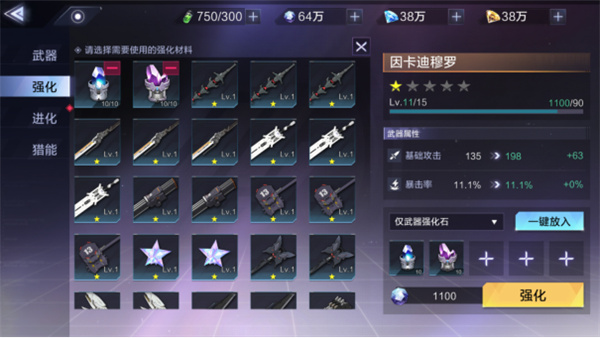 获得武器之后,接下来就要给武器进行升级了,通过消耗强化石或者低阶装备,即可强化武器并提升武器的基础属性。前期资源有限,优先给主力提升武器等级,运气好成抽到橙色武器直接用,抽不到就不关什么品质的武器先升级确保自己的战力和实战强度。