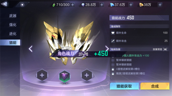 除了强化之外,猎能也是提升战力的重要项目,所有武器都可以镶嵌猎能,猎能是每把武器都需要镶嵌的,镶嵌之后猎人会在实战中获得额外的属性加成。另外,猎能是可以合成的,你在挑战低级副本获得的低级猎能可以合成更高级的。所以副本不管能打到什么难度,一定要去挑战试一试,打到所能打的最高副本获取奖励,剩下的就靠慢慢合成。