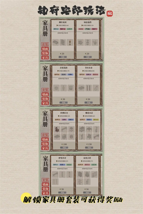 解锁家具册套装可获得奖励(建筑和风格要求如图)