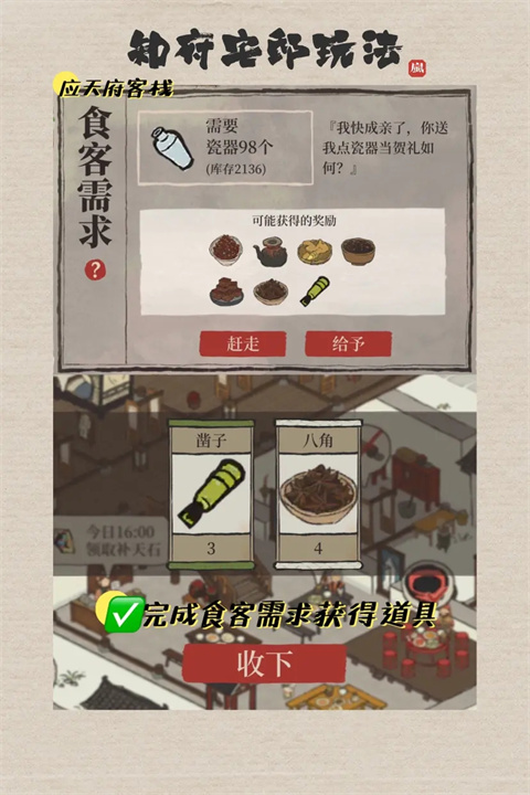 除此之外【应天府】客栈完成食客需求可获得【凿子】