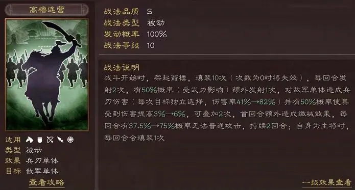 随着越来越多的控制出现,缴械能力在三战中变得稀少起来。所谓是物以稀为贵,想要克制目前盛行的普攻、突击队伍,缴械作为震慑的补充,肯定是多多益善,尤其SP袁绍的缴械能力还是从指挥战法中而来,并且作用于前几回合的黄金爆发期,放眼整个游戏,这种克制能力,也只有盛气凌敌可以一比。在我眼里,SP袁绍跟盛气凌敌基本可以划等号,可以各领一队,给自己打造出2个克制普攻、突击的阵容。 除了缴械外,这个战法本身还是一个稳定的输出,在上次更新之后,每回合发射3次的几率有所提升,使SP袁绍的输出能够提前到来,同时还带有一个增伤效果,非常的nice。