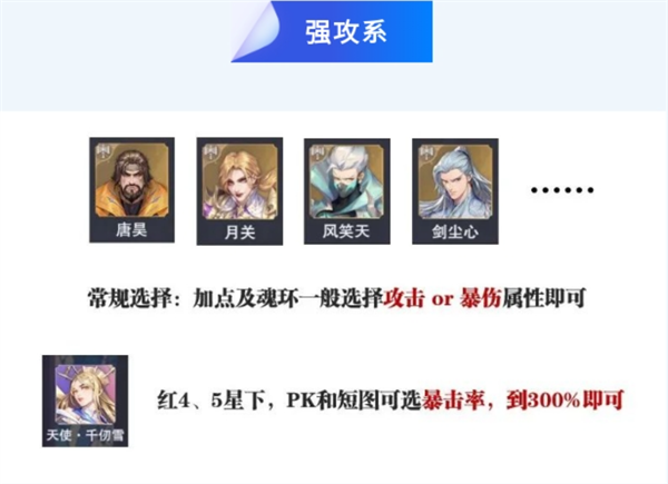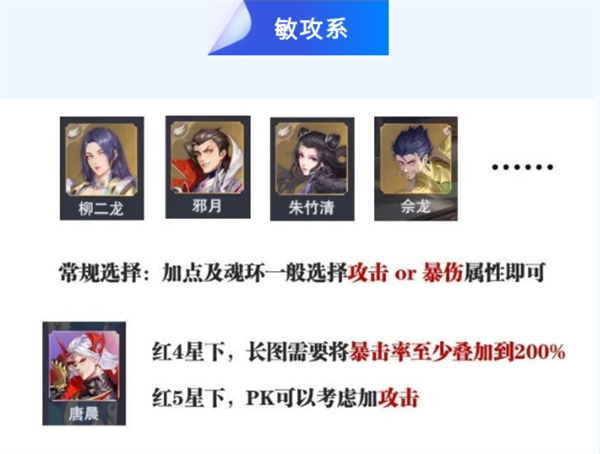 而接看针对敏攻系:基础逻辑和强攻系还是比较类以的:普遍加点攻击or暴伤来提升伤害即可,而针对热魂师中的S唐晨,在红4星时的长图战斗中可以考虑将暴击率最少叠到200%以上来体现出2-1被动【负狂名】的增伤效果,甚至叠到300%也是可以考虑的,这样可以进一步提升唐晨的附加伤害增伤;