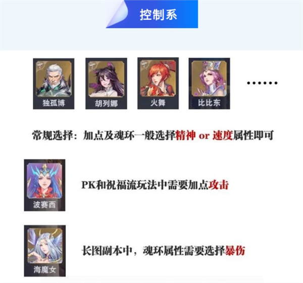 接着针对控制系魂师,一般都会选择精神属性来提升控制概率或者选择速度来提升控制频率,不过其中也有2个例外,波赛西在长图祝福流增伤和PK中需要加点攻击,长图是为提升增伤幅度,PK是为提升1技能【无尽风暴】的限制概率,此外海魔女在长图中魂环需要选择暴伤来提升增伤,因为加点她也是没法选择暴伤的,所以只能从魂环属性下手了。
