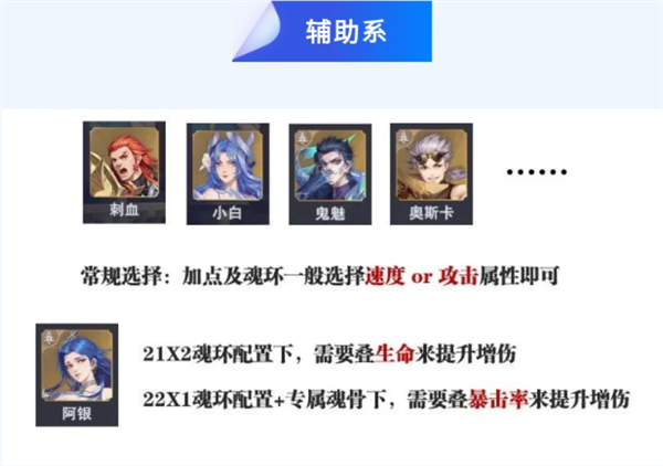 接着针对辅助系魂师,一般来说都是选择速度来提升辅助频率,或者选择攻击来提升增伤效果,其中也有一个例外便是阿银,21×2魂环配置下需要加生命来提升2-1被动所提供的增伤效果;