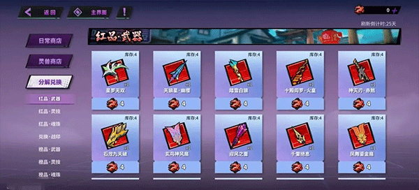 可以把红武分解,然后在“黑市→分解兑换→红品●武器”兑换指定红武(4把换1把)。