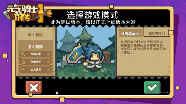 【快速匹配】:顾名思义就是快速匹配到等级相近的玩家组队联机,如果没有匹配到的话则会新建房间并且附带有邀请码,这时点击【邀请码】可直接复制,把邀请码告诉你的小伙伴,他只需输入邀请码就能进房间一起刷图了!如创建的房间如人数未满,其他小骑士也可以通过【快速匹配】进入你的房间一起组队冒险哦!
