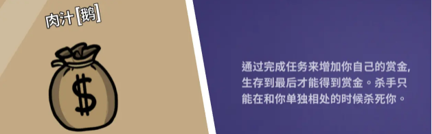肉汁:通过完成任务来增加自己的赏金,生存到最后才能得到赏金,杀手只能与你单独相处的时候杀掉你。
