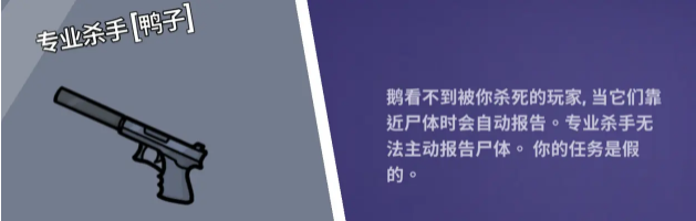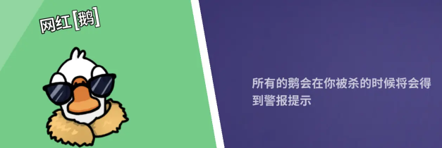 专业杀手:游戏内带刀,鹅看不到被你杀死的玩家,靠近时会自动报警(刀加拿大鹅不会报警)。