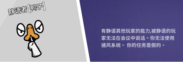 静语者:游戏内带刀,可以静音一名玩家,使其该玩家在会议中无法发言,但不可以钻管道。