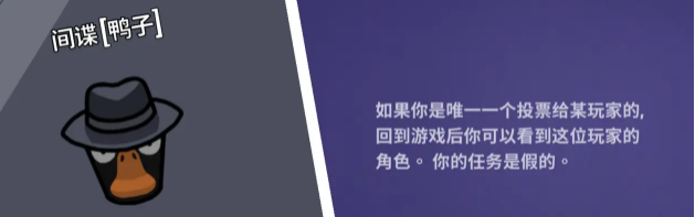 间谍:游戏内带刀,如果你是唯一一个投票给某位玩家的,回到游戏后你可以看到该名玩家的身份。