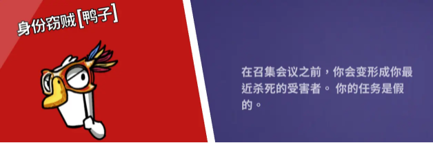 身份窃贼:游戏内带刀,在召集会议之前,会变形成你最近杀死的受害者。
