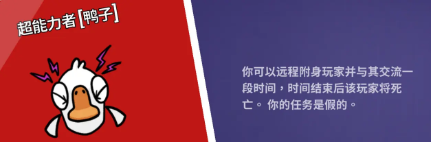 超能力者:游戏内带刀,可以远程附身玩家并与其交流一段时间,时间结束后该玩家将死亡。