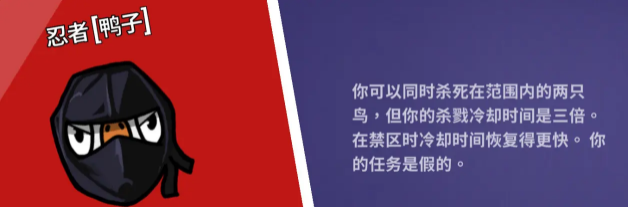 忍者:游戏内带刀,可以同时杀死范围内的两名玩家,但杀戮冷却时间变成三倍,在禁区内回复变快。
