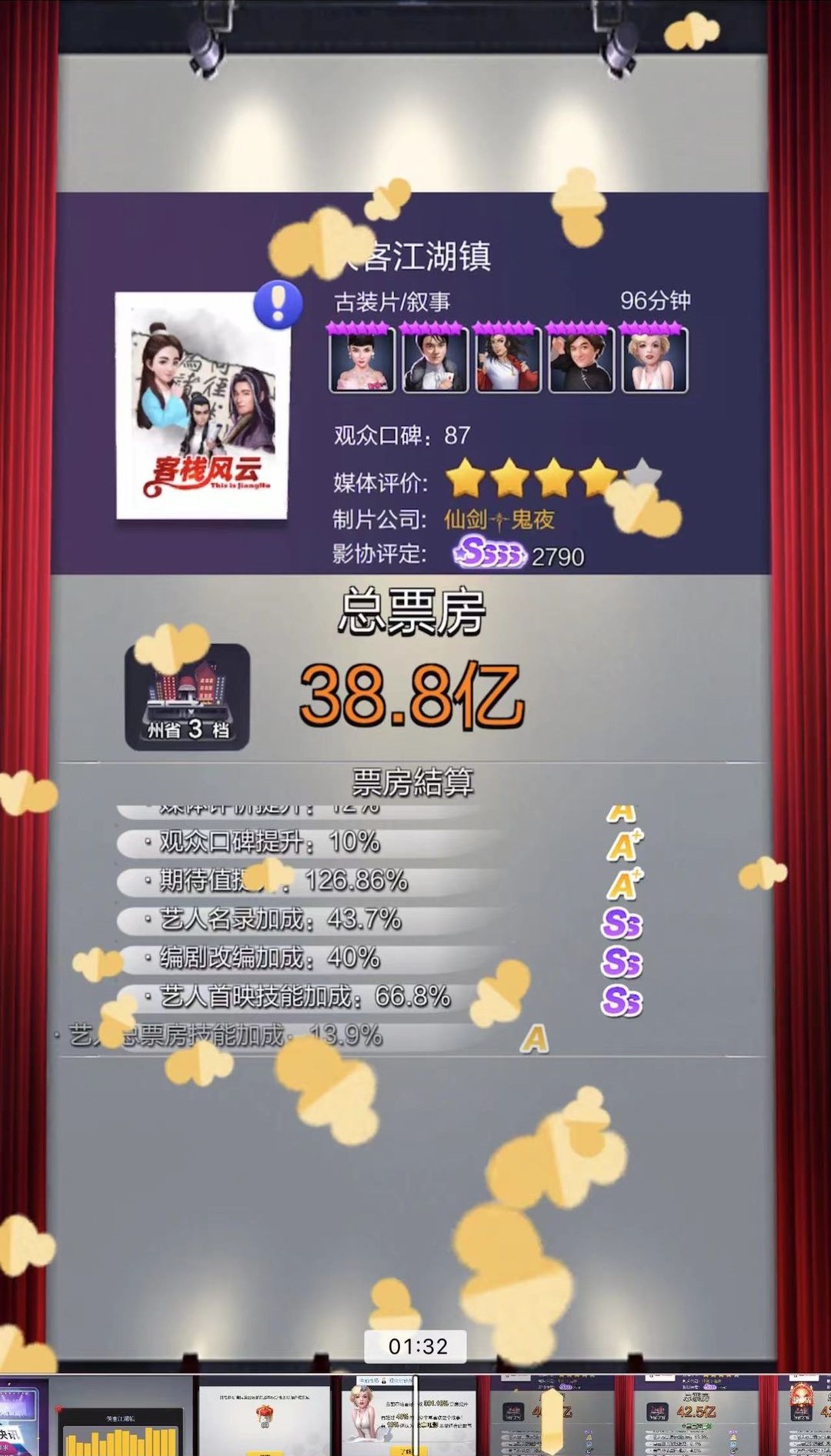 最终总票房 = 结算总票房+初始总票房*(∑ 艺人总票技能+∑ 踢一脚5%)+ ∑ 艺人助理票房加成