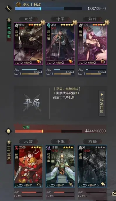 周泰陆抗甄洛,也就是大家通称的肉队开荒,这队开荒速度其实和马超没有实质区别,甚至更为稳定,而且这队很难打出大劣输的战报,给了我们补刀的空间,这点在开荒期非常重要,比如你劣势平第一个5,迅速拉预备上补刀,即可成功开5,这样开荒基本可以宣告成功。